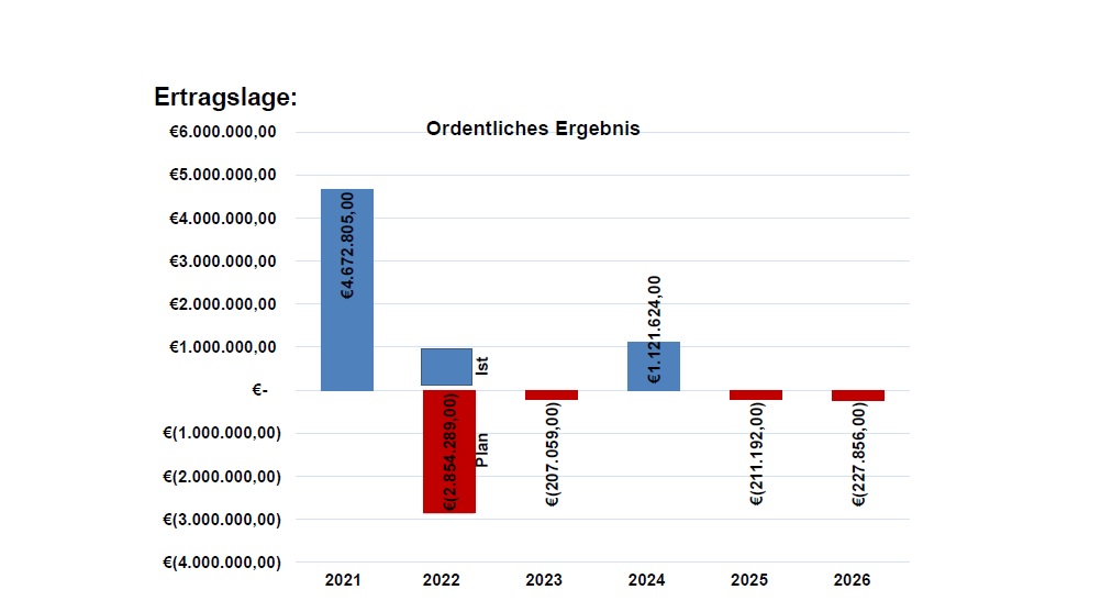Im Vergleich zum Jahr 2022 steigen die ordentlichen Erträge im Jahr 2023 um rund 2,6 Mio. Euro, die Aufwendungen bleiben nahezu stabil, was uns das Defizit im