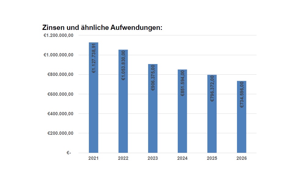 Bei den Zinsen und ähnliche Aufwendungen sind die Kreditzinsen sowie die Kosten des Geldverkehrs veranschlagt. Auf diese Position wirkten sich zwei Dinge Positiv aus. Zum einen das entfallende Verwahrentgelt zum anderen der Rückgang unserer Schulden, was zu geringeren Zinszahlungen führt.