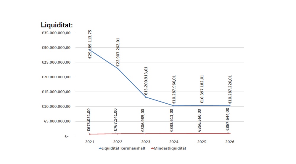 Die Liquidität stellt somit in Verbindung mit den Überschüssen bzw. Fehlbeträgen des Ergebnishaushalts, die wesentliche Steuerungsgröße für Politik und Verwaltung dar. Darüber hinaus ist die Liquidität seit der Einführung des neuen kommunalen Haushaltsrechts in einer Anlage zum Haushaltsplan nachzuweisen und dient als Kriterium zur Genehmigungsfähigkeit eines Haushaltsplans. Die Mindestliquidität nach §22 Abs. 2 GemHVO muss mindestens zwei vom Hundert der Summe der Auszahlungen aus laufender Verwaltungstätigkeit nach dem Durchschnitt der drei dem Haushaltsjahr vorangehenden Jahre belaufen. Die Mindestliquidität ist im gesamten Planungszeitraum problemlos gesichert.