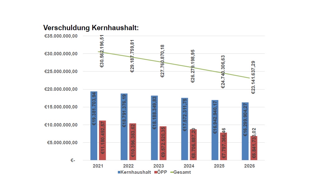 Da wir im Planungszeitraum sämtliche Investitionen aus der vorhandenen Liquidität stemmen werden, sind auch im vorliegenden Haushaltsplan und das ist positiv keine Kreditaufnahmen vorgesehen. Wir kommen damit unserem strategischen Ziel, die Schulden binnen 15 Jahren zu halbieren, einen weiteren Schritt näher. In Euro ausgedrückt bedeute dies, dass die Schulden im Kernhaushalt von 2023 bis 2026 um rund 4,6 Mio. auf dann rund 23,1 Mio. Euro zurückgehen.