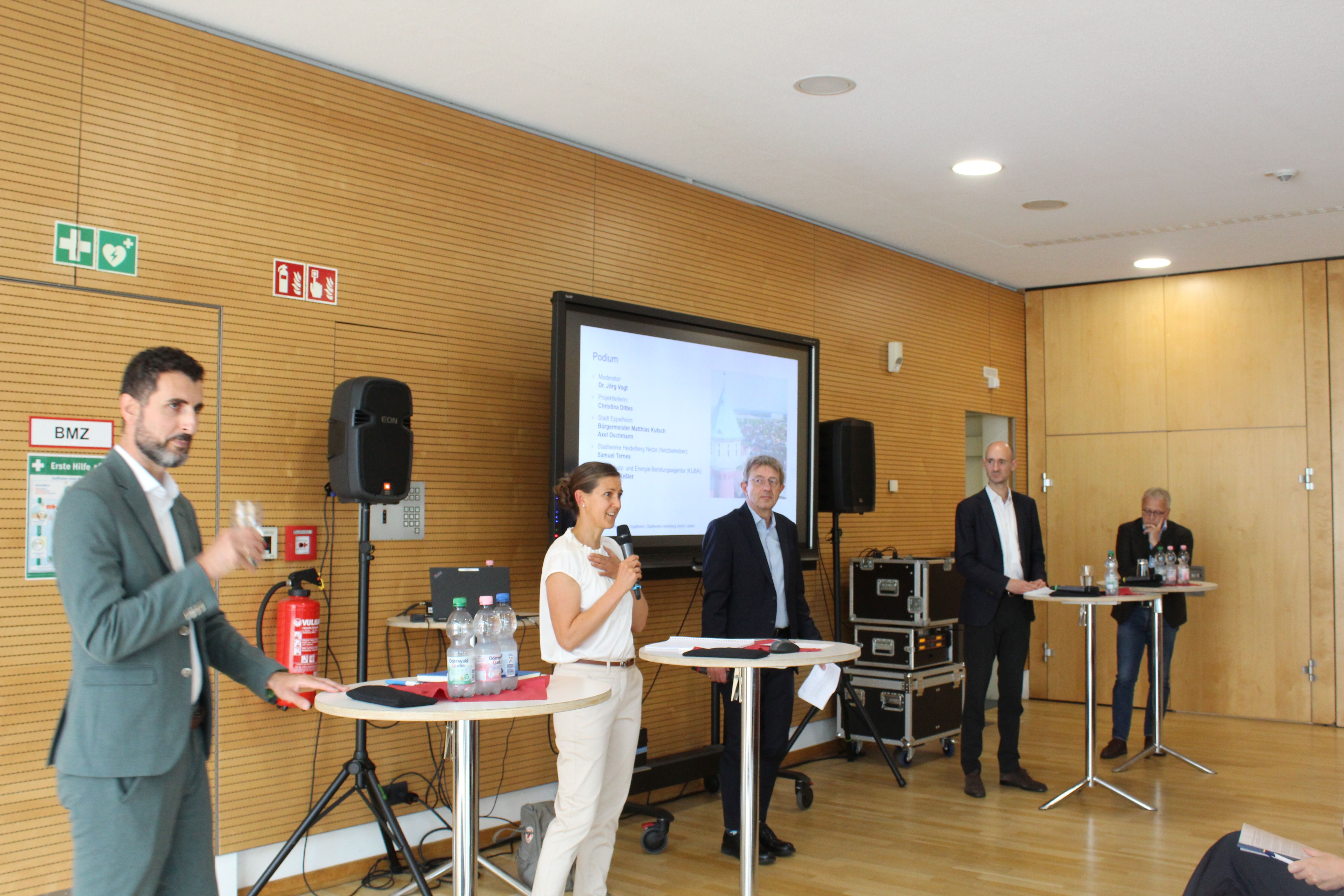 Die zweite Informationsveranstaltung zum Thema kommunale Wärmeplanung fand am 23. Juli 2025 im Foyer der Rudolf-Wild-Halle statt. Bürgermeister Matthias Kutsch begrüßte mit Moderator Dr. Jörg Vogt (Stadtwerke Heidelberg), Samuel Ternes vom Netzbetreiber SWH-N und Dr. Klaus Keßler von der KLiBA die Podiumsteilnehmer.