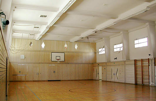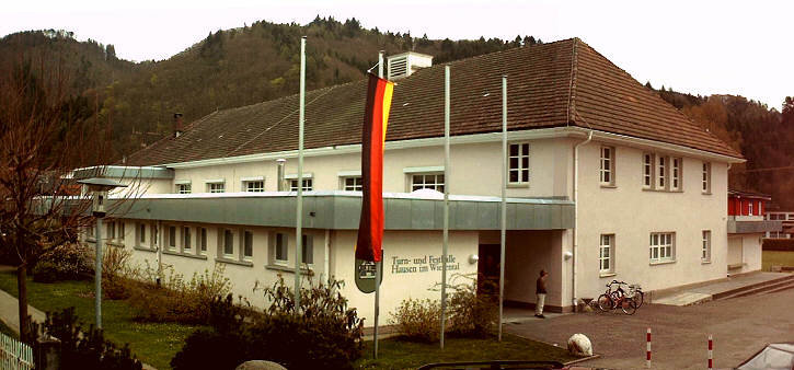 In den 50er- Jahren wurde, um die Festhalle von 1935 sinnvoll für den Sportbetrieb nützen zu können, auf der rechten Seite ein Geräteraum angebaut. Doch der Verschleiß und die in den Saal hineinragenden Pfeiler bildeten eine ständige Gefahr beim Schul- und Vereinssport.