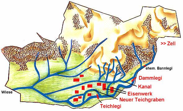 Die vergleichsweise gute "Wassersituation" Hausens gab bei der Wahl für den Standort eines Eisenwerkes den Ausschlag und mit dem Neubau Werkes 1682 änderte sich das Grabensystem. Das Wuhr wurde der Gemeinde abgenommen, das Eisenwerk nutzte die Wasserkraft für das Hochofengebläse und die Hammerschmiede. Die weitaus größere Menge Wasser floss vom Wuhr in einen doppelläufigen, die Schmiede mit insgesamt 13 Wasserrädern rechts und links passierenden Kanal (in der Zeichnung nicht korrekt wiedergegeben), der des größeren Gefälles wegen direkt in die Wiese geführt wurde. Der Teichgraben bekam somit nur noch wenig Wasser zugeteilt und fiel häufig trocken. Die Verwaltung des Eisenwerks begann alsbald nach der Erstellung des Werkes eine größere Wasserzuführung aus der Wiese zum Werk hin zu planen. Unterhalb der Bannlegi wurde um 1685 eine weitere Legi mit Kanal in die Wiese gebaut, die Dammlegi. Sie lieferte eine größere Wassermenge als die alte Bannlegi. Das Wuhr schüttete man im oberen Bereich zu, die Bannlegi wurde aufgelassen. Trotzdem reichte in Trockenzeiten das Wasser oft kaum für das Werk, die Situation für das Wuhr und den alten Teichgraben hatte sich nicht wesentlich verbessert.