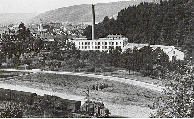 Zwischen Bahnlinie und Fabrik die alte B 317, heute liegt sie direkt an der Bahnlinie. Im Hintergrund, mitten im Dorf, die katholische Kirche